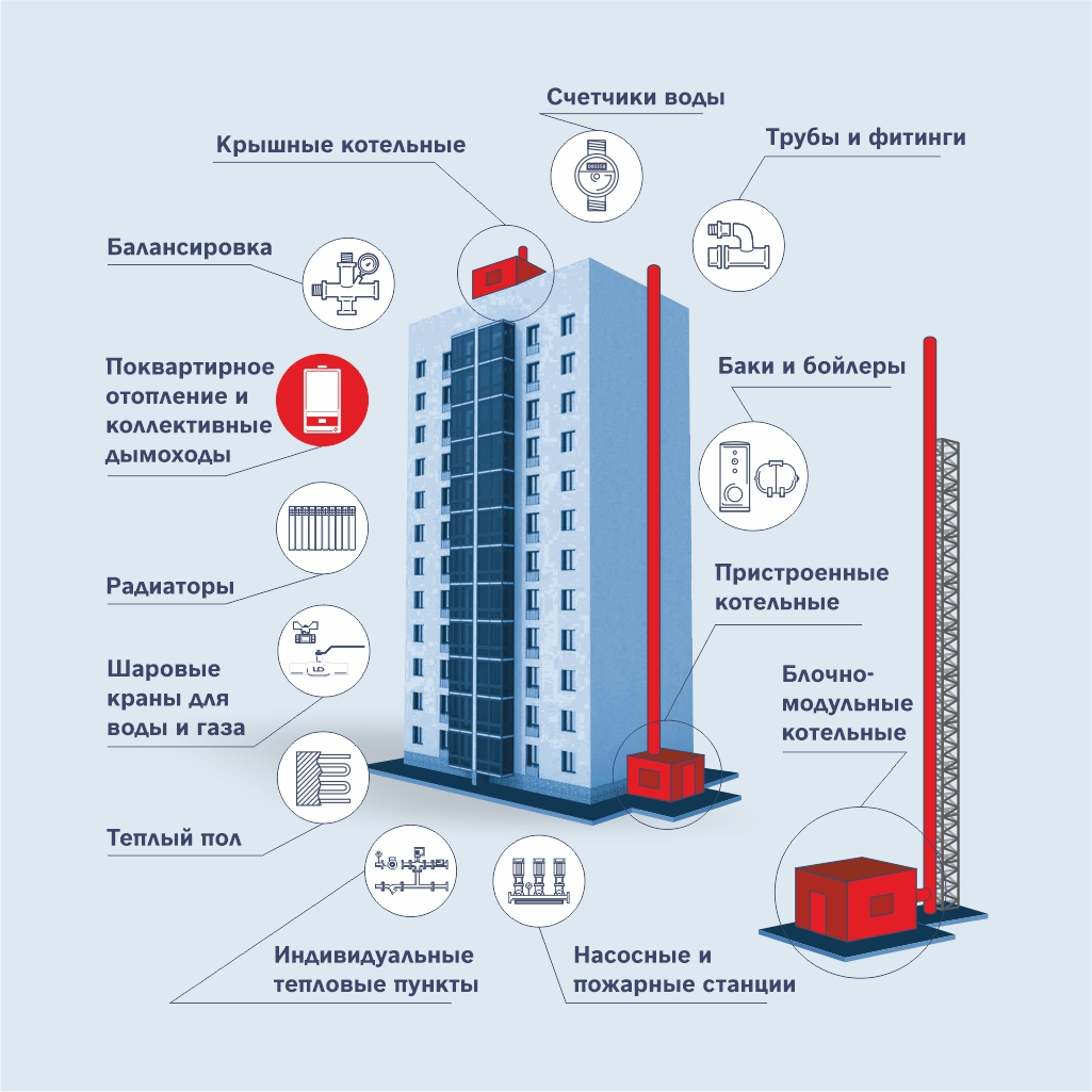 Комплексные поставки оборудования и монтаж инженерных систем бытового, муниципального и коммерческого назначения в сфере отопления, водоснабжения и газоснабжения.