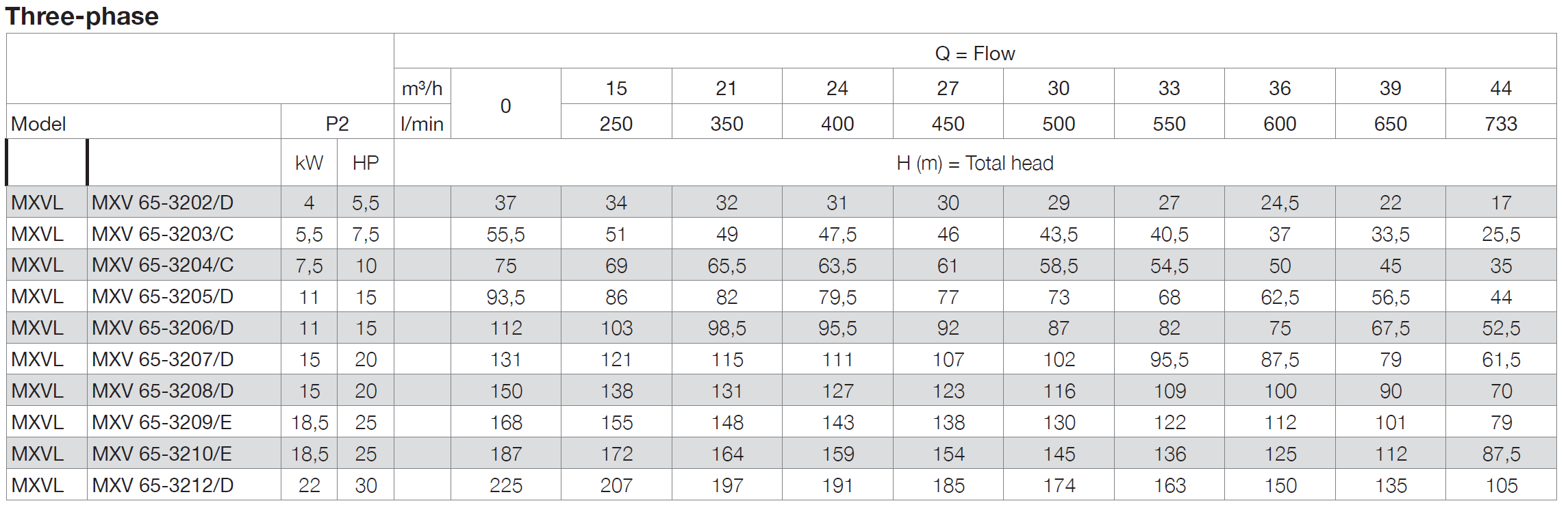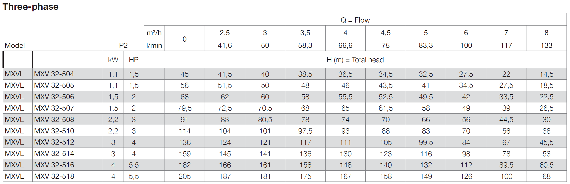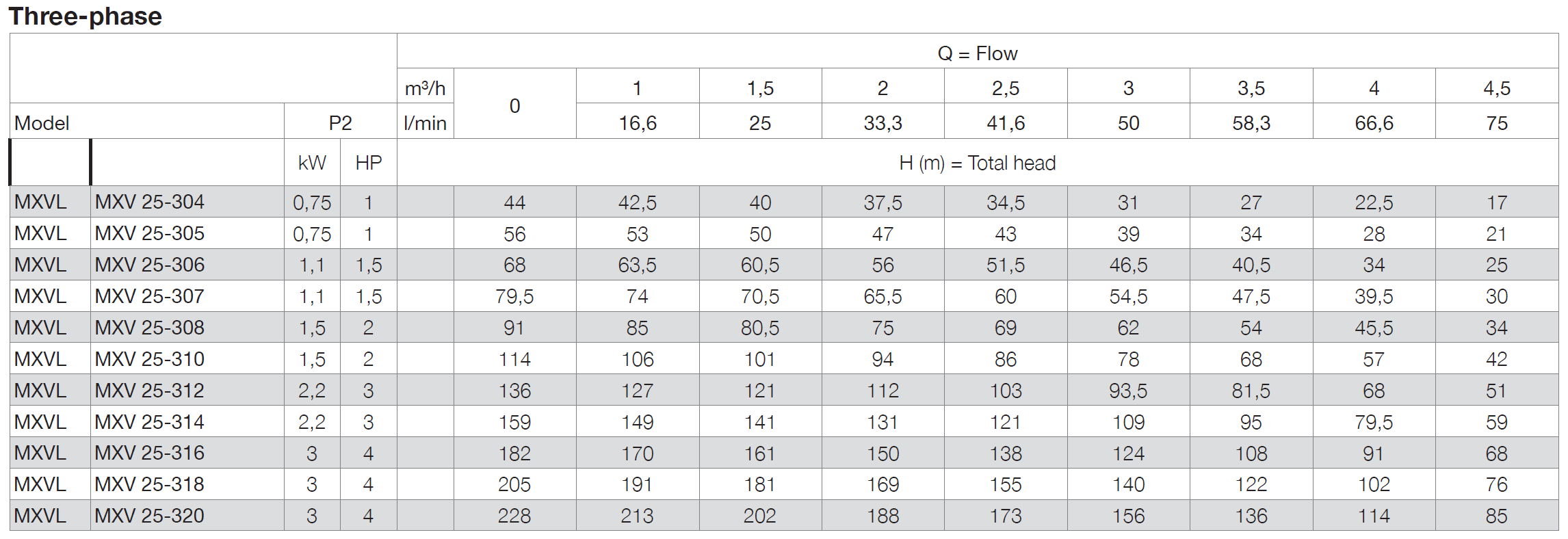 Многорядные вертикальные многоступенчатые насосы Calpeda MXV с всасывающими и подающими раструбами имеют одинаковый диаметр и расположены на одном валу (многорядное исполнение). Насос Calpeda MXV укомплектован упорным подшипником, а также соединением с втулкой для использования любого стандартного двигателя модели V1. Как правило, направляющие втулки смазываются перекачиваемой жидкостью и устойчивы к коррозии.