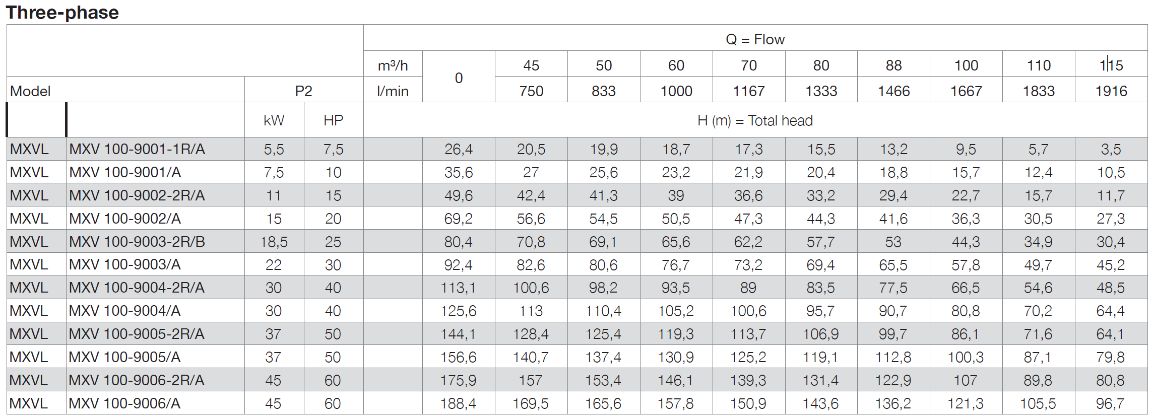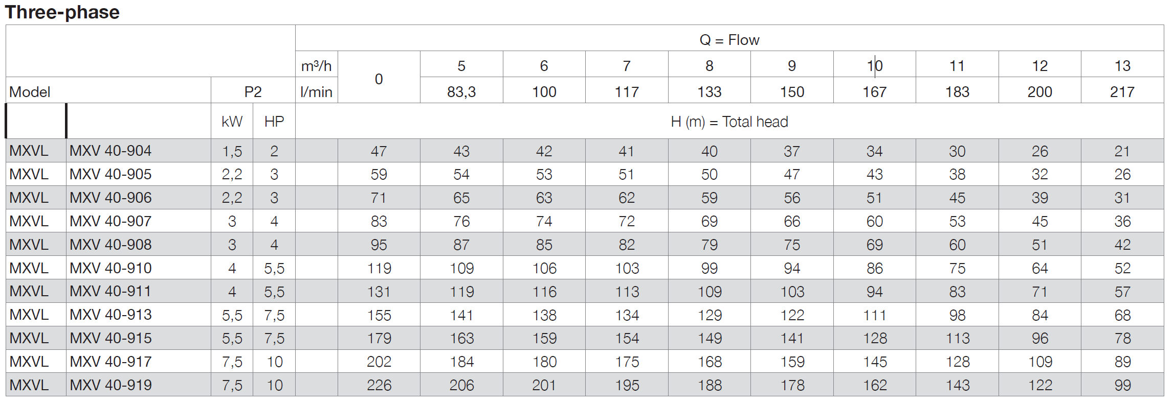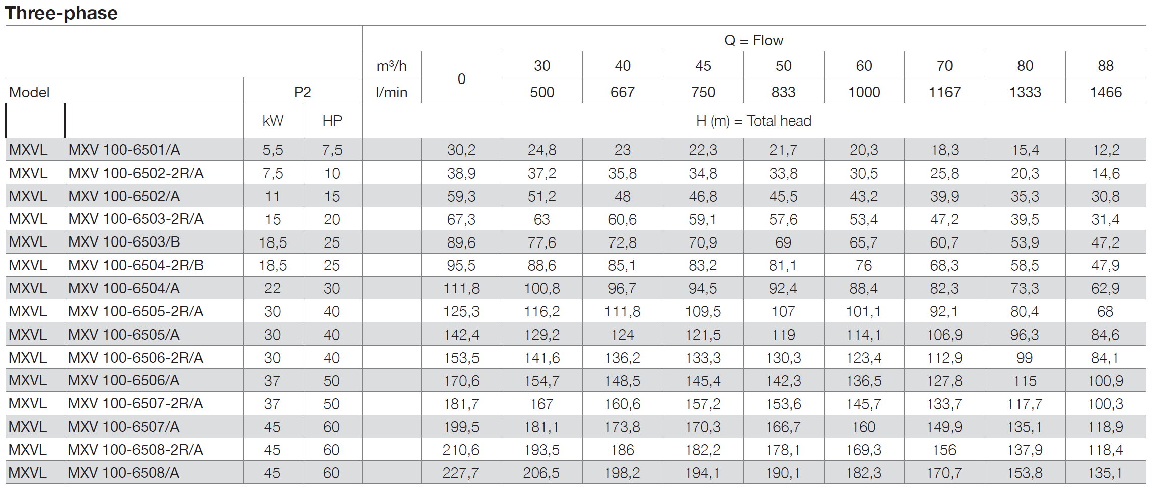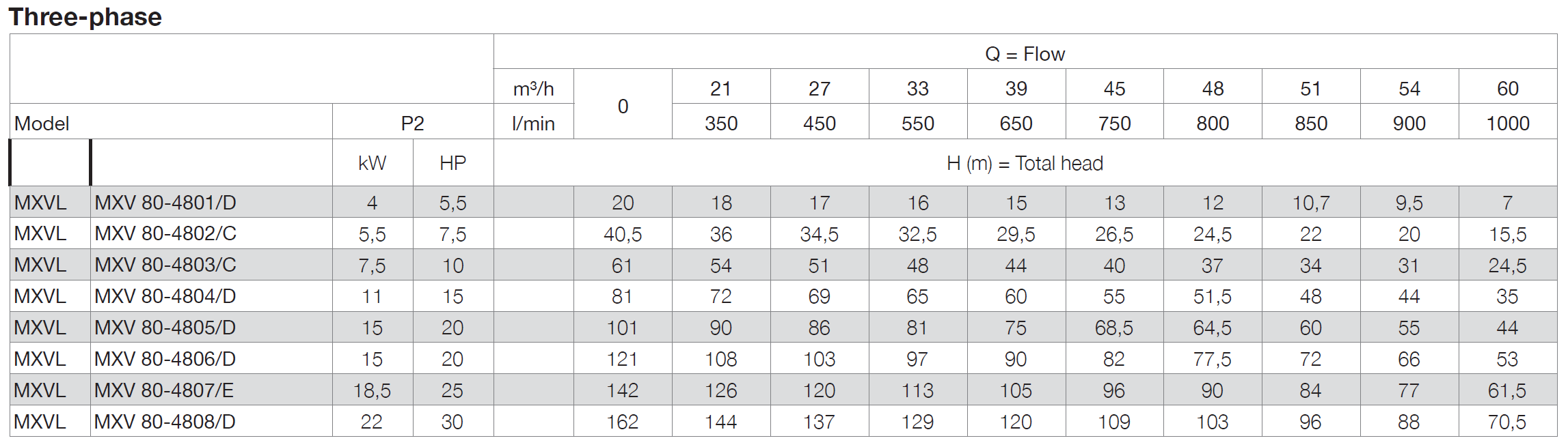 Многорядные вертикальные многоступенчатые насосы Calpeda MXV с всасывающими и подающими раструбами имеют одинаковый диаметр и расположены на одном валу (многорядное исполнение). Насос Calpeda MXV укомплектован упорным подшипником, а также соединением с втулкой для использования любого стандартного двигателя модели V1. Как правило, направляющие втулки смазываются перекачиваемой жидкостью и устойчивы к коррозии.