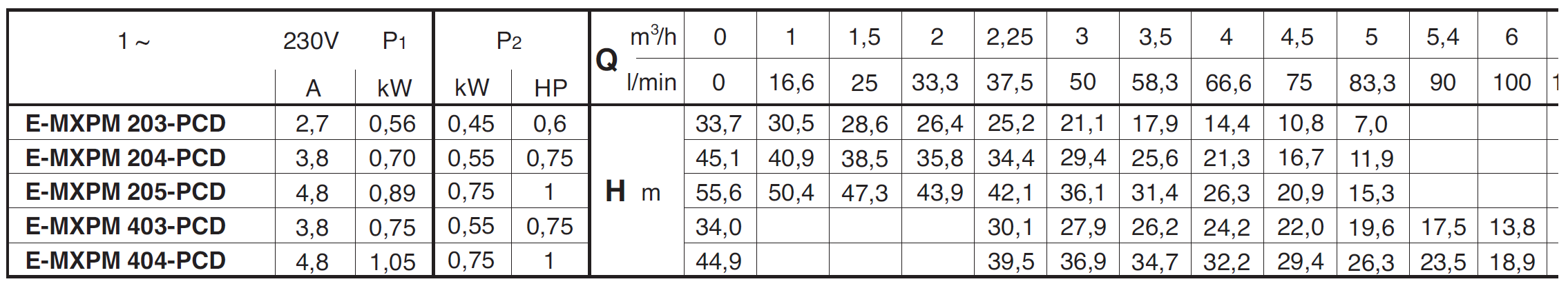 E-MXPM 205 PCD | 0.75 кВт | 220 В | 3 м3/ч | 5 м3/ч | 36.1 м | 55.6 м | 25 | 25 | 60 528 |