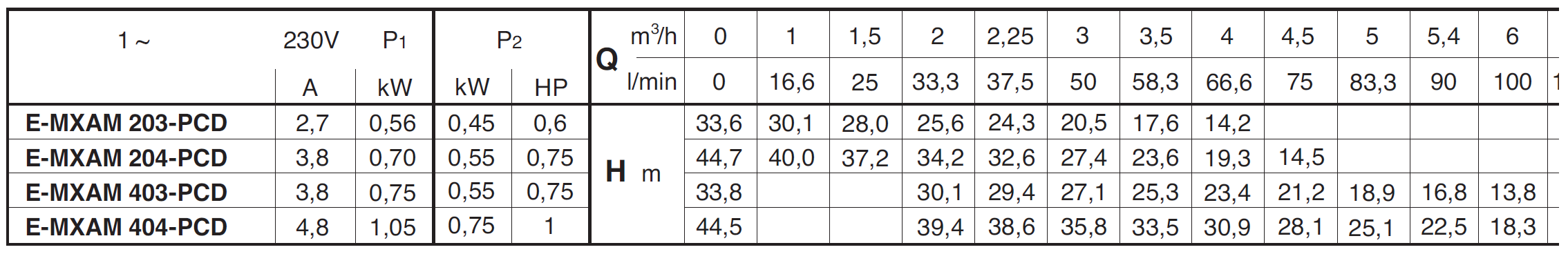 E-MXAM 403 PCD | 0.55 кВт | 220 В | 3.5 м3/ч | 6 м3/ч | 25.3 м | 33.8 м | 25 | 25 | 45 656 |