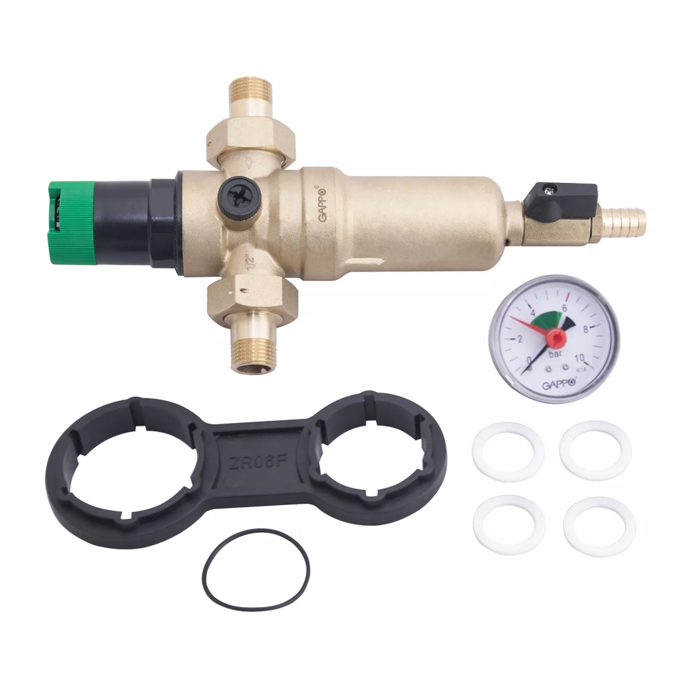 Фильтр промывной НР со встроенным поршневым редуктором давления для горячей воды Gappo, сетчатый, с манометром и дренажным краном