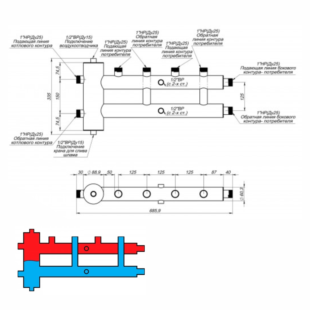 Коллектор распределительный с гидрострелкой предназначен для устройства систем отопления с 3 потребителями тепла с различными параметрами расхода и температуры теплоносителя.