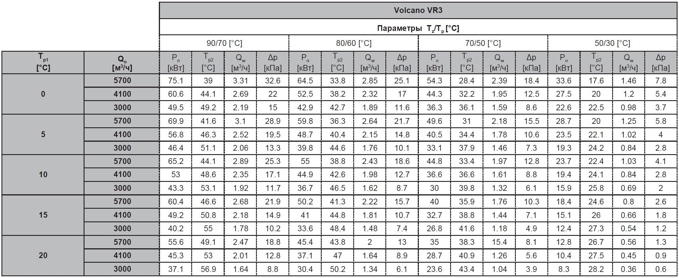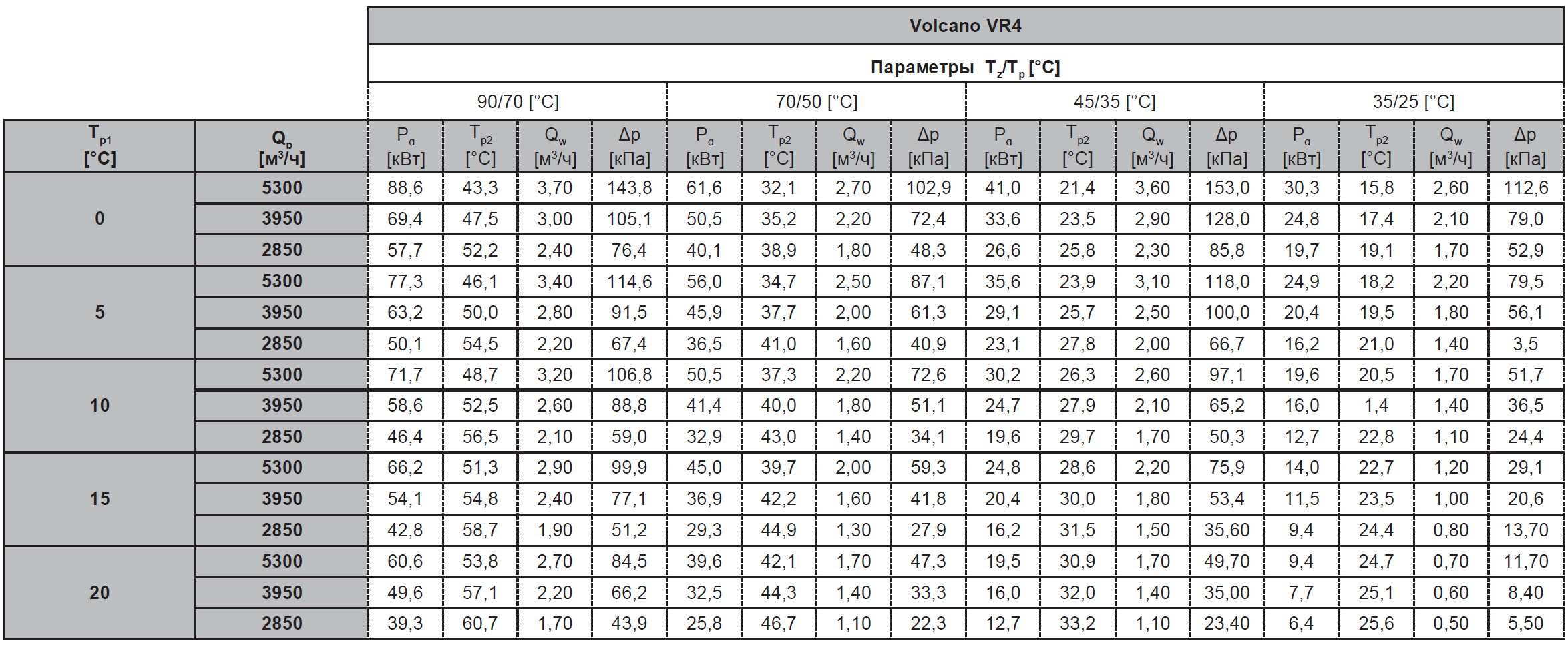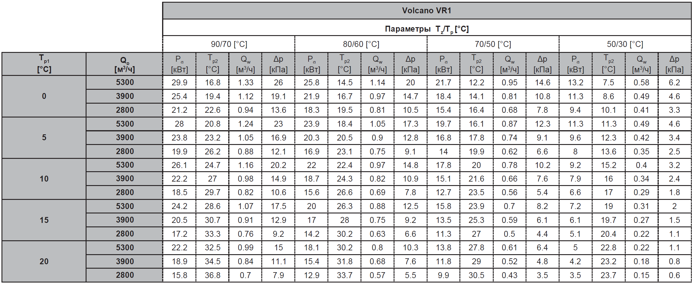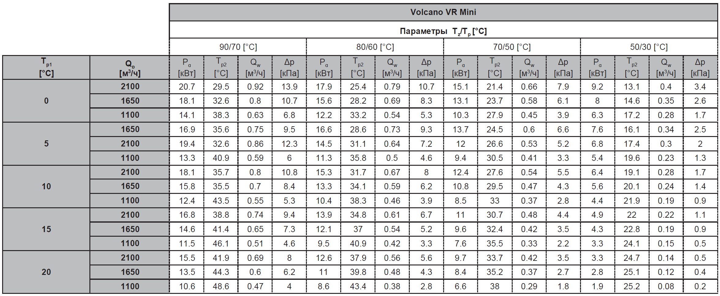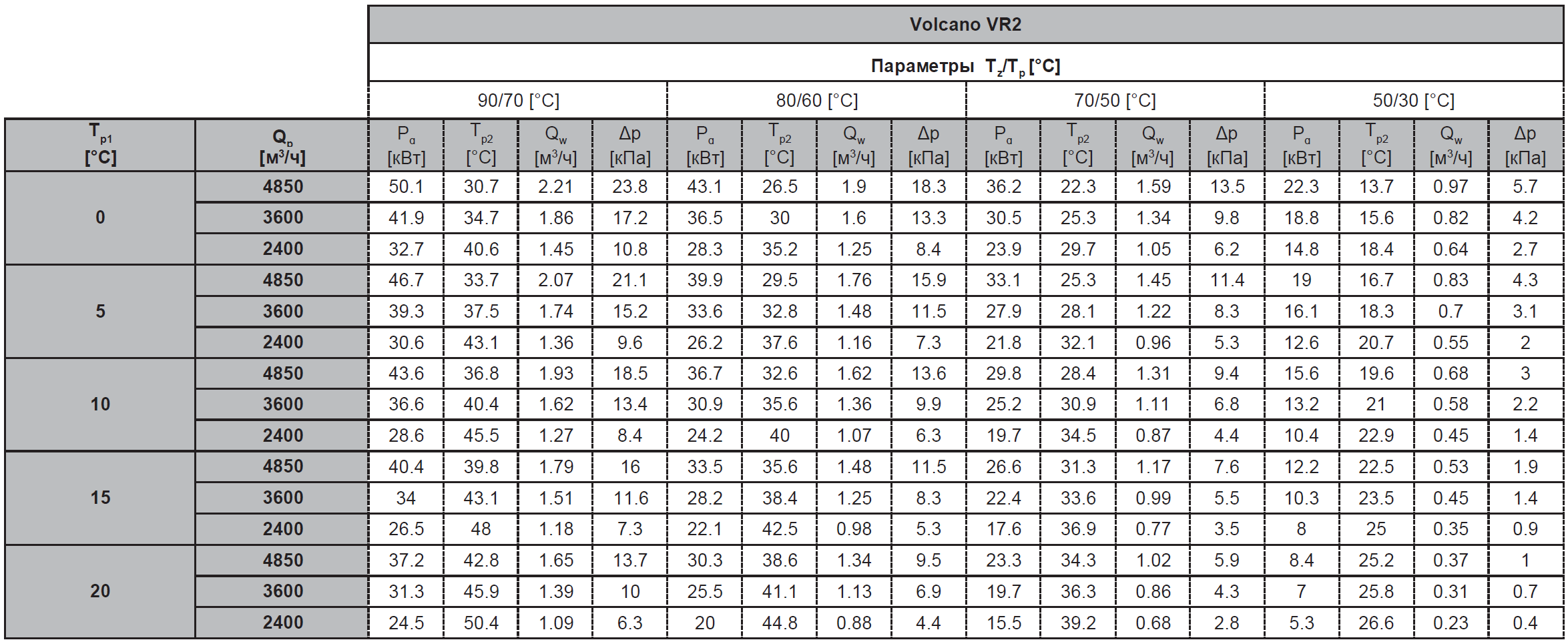 Tz – температура воды на входе; Tp – температура воды на выходе; Tp1 – температура воздуха на входе; Tp2 – температура воздуха на выходе; Pg – тепловая мощность оборудования; Qw – расход воды; Qp- расход воздуха; Δp – гидравлическое сопротивление